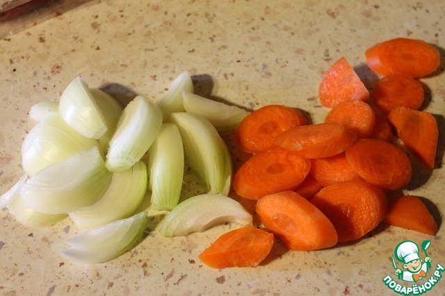 Морковь нарезать толстыми кружочками, лук толстыми полукольцами. Чеснок очистить и раздавить ножом.
