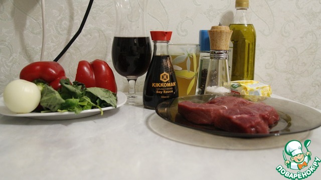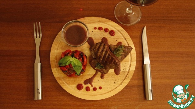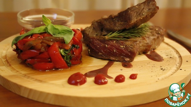 | Говяжья вырезка с гарниром из сладкого перца с базиликом и с соусом из красного вина! |