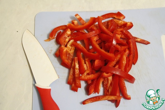 Приступаем к гарниру... нарезаем перец соломкой и луковицу полукольцами