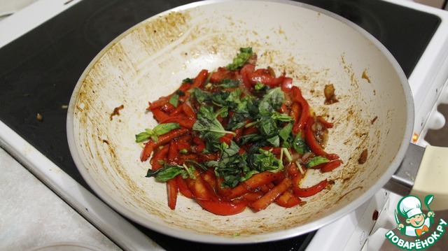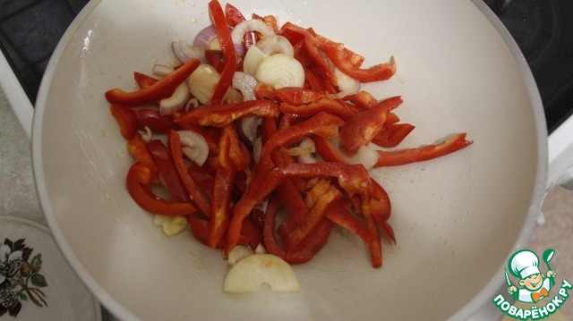 Обжариваем на оливковом масле перец и лук в течение 1 мин.