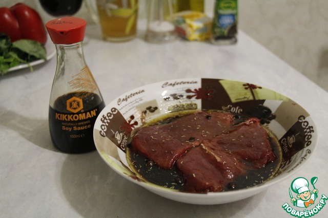 Кладем наше мясо в маринад и оставляем на 15-20 мин. ( В это время можно перейти к гарниру и соусу) Но о них позже!