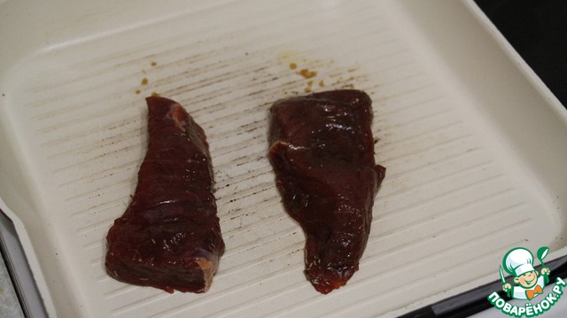 По истечению времени отведенного на маринад обжариваем наше мясо на сковороде гриль (или на обычной с добавлением олив. масла) Я обжариваю 2,5 см по 3 мин. с каждой стороны!!! Всё зависит от степени прожарки которая нравится вам!!!