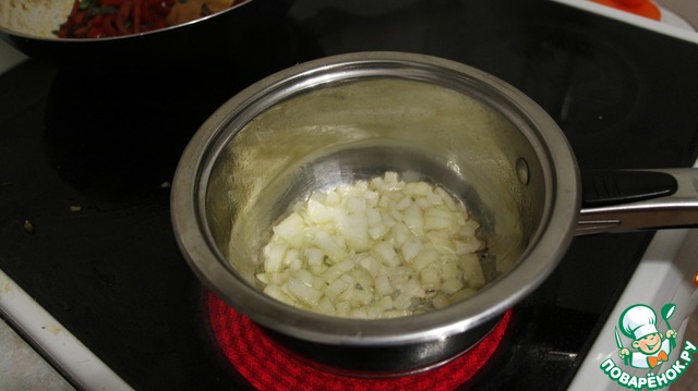 Лук нарезаем кубиком и обжариваем его на оливковом масле.