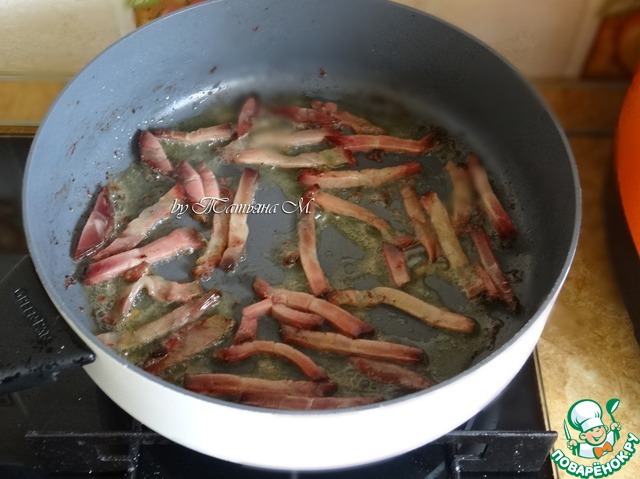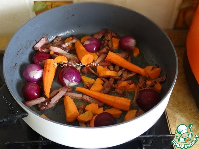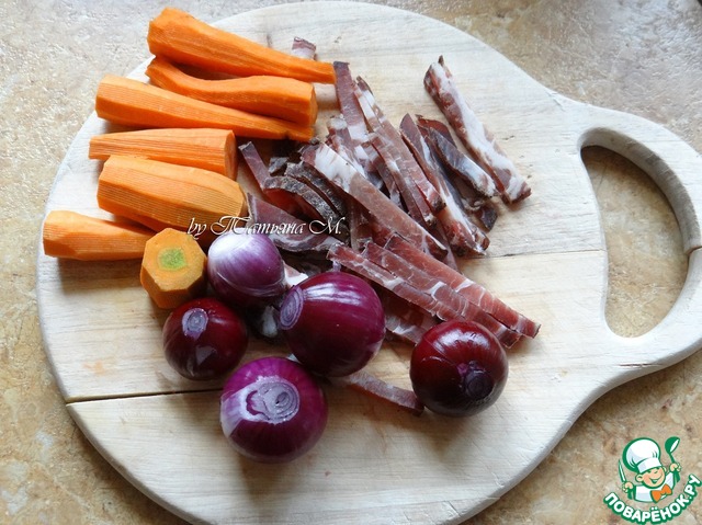 Грудинку (у меня сыровяленная свиная шея) порезать полосками, крупный лук - пополам, крупную морковь - кружочками или полукругами;