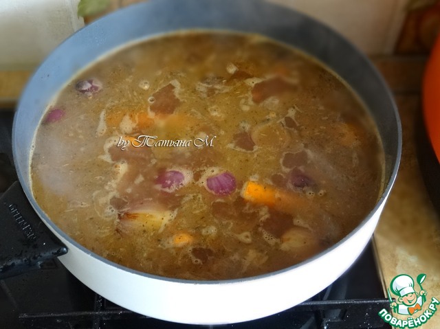 Вернуть мясо в сковороду, влить бульон, довести до кипения, добавить соль по вкусу, тимьян, паприку, чеснок, кориандр;