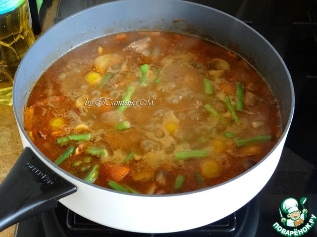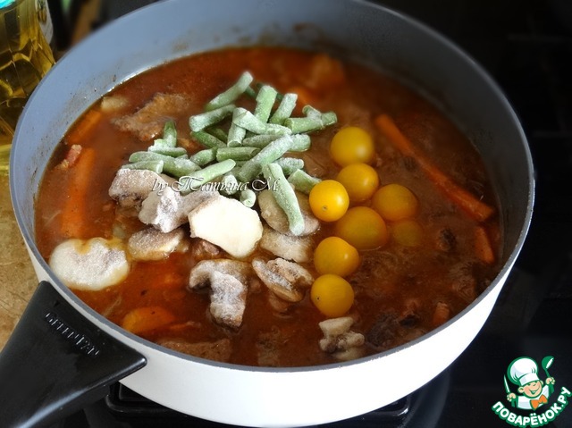 За 10 минут до готовности добавить резанные шампиньоны, фасоль и черри;