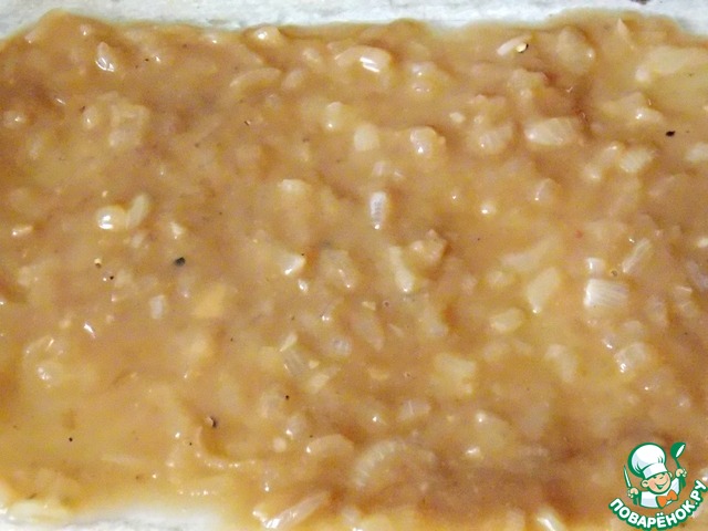 Делаем соус. Для этого мелко шинкуем лук и обжариваем на сковороде с растительным маслом на маленьком огне помешивая 15 мин. Всыпаем муку, перемешиваем и жарим еще 2 мин. Влить уксус (если нет такого, то замените его красным сухим вином), перемешать, добавить бульон и проварить еще 15 мин. помешивая, чтобы не пригорел. Здесь есть один момент. Мука у всех разная, а это значит что и густота будет разная. Так вот Соус должен быть по консистенции как кисель средней густоты. Если это не так то добавьте бульон до нужного состояния, иначе соус пригорит. Пробуя соус мне не хватило сладости и я добавила коричневый сахар. Подгоните его под свой вкус. Снимаем с огня и часть соуса распределить на дне формы.