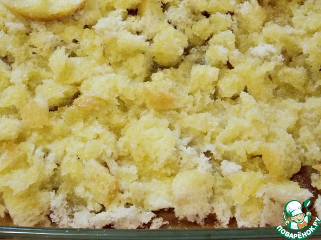 Булку или белый хлеб раскрошить и засыпать полностью верх соуса. Масло растопить и нагреть, полить поверх крошек. Здесь тоже есть одно уточнение. По мне масла слишком много, хватило бы и 100 гр.