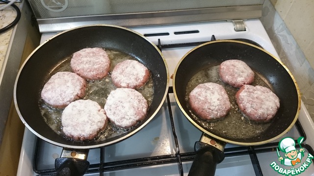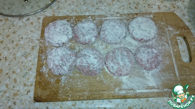 Отделяем из фарша шарики в ладошку, кидаем в муку, чуть катаем и, прижимая с обеих сторон, формируем котлету