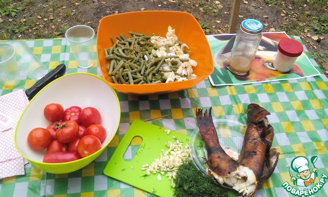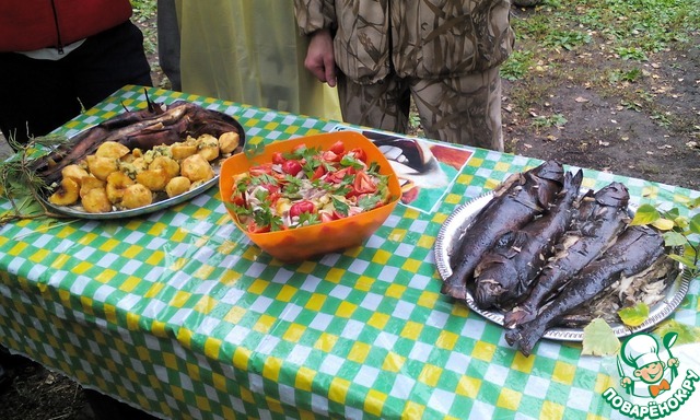 | Дорогие поварята, спешу поделиться с вами рецептом "Салата для пикника", который наша команда делала на фестивале костровой еды "Казан-мангал". Приготовили его из "конкурсных ингредиентов."Главным нашим блюдом была копченая рыба (терпуг и судак), ее и взяли за основу салата. Попробуйте и вы! |