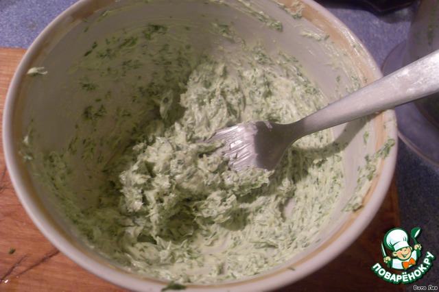 Измельчаем укроп (я использовала блендер) и смешиваем со сливочным маслом, выдавить зубчик чеснока (по желанию).
