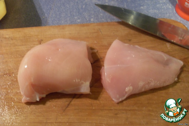 Широким ножом делаем надрез внутри, но не прорезаем до конца. Получается карман. Слегка отбиваем (я бы даже сказала приминаем), чтобы не разорвать стенки. Натираем солью и специями сверху и внутри. Отставляем в сторону.