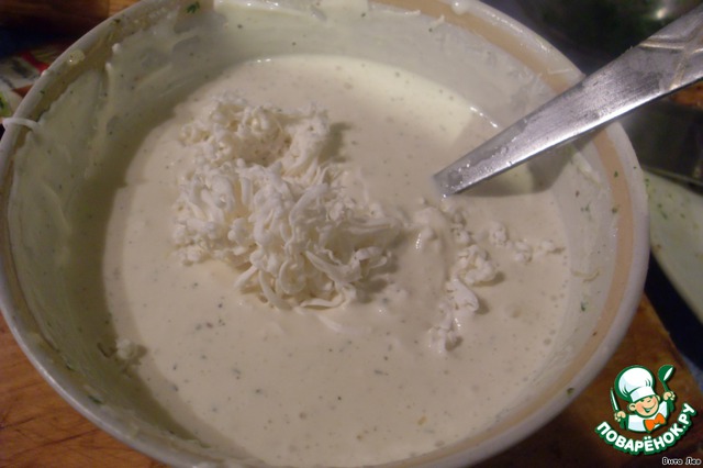 Готовим заправку: сметану смешиваем с горчицей, солью и натертым сыром. Если заправка густовата - разведите водой или бульоном.