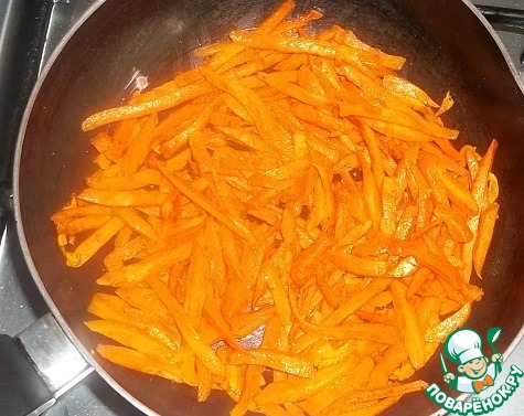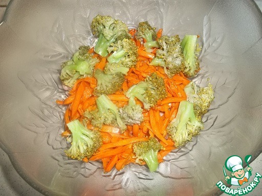 Между тем, морковь натереть на терке для корейской моркови или нарезать тонкими брусочками. В сковороде разогреть 1ст. л. раст. масла, обжарить слегка морковь около 5 минут, добавив щепотку соли и душистого перца. Брокколи отварить в подсоленной воде, разобрать на маленькие соцветия.