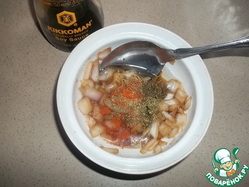 Лук мелко нарезать, залить соевым соусом, перемешать. Мариновать 10-15 минут.