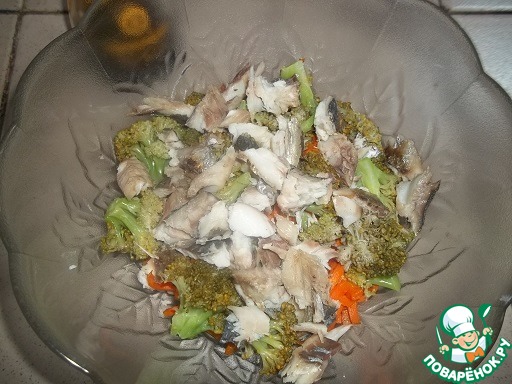 Копченую скумбрию, разобранную на небольшие кусочки.
