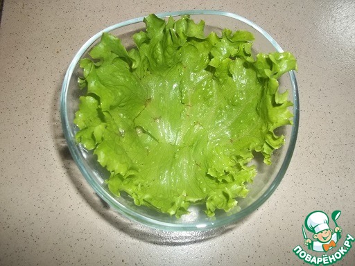 Порционную подачу можно оформить так : у большого салатного листа отрезать верхнюю часть и красиво уложить в порционную вазочку или на тарелку.
