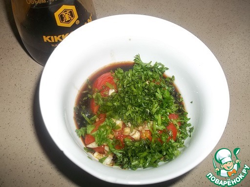 Добавить нарезанные чеснок и свежую зелень, 2 ст. л. соевого соуса,