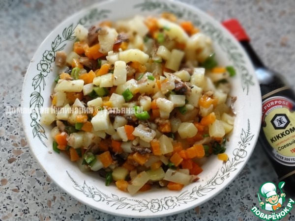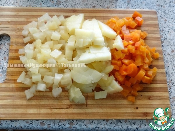 Одинаковыми кубиками порезать морковь, картофель, ананас (количество ингредиентов должно быть примерно равное);