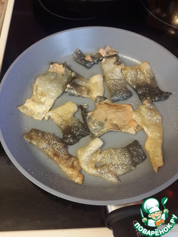 На сковороде нагреть масло и обжарить с двух сторон нарезанную кожу лосося. (примерно 3-5 минут)