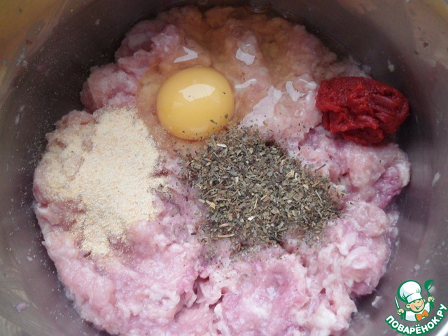 Смешать мясной фарш с яйцом, солью, базиликом, чесночным порошком и томатной пастой.