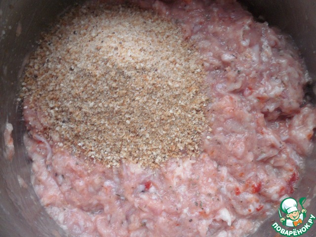 Добавить к массе ¼ стакана молотых сухарей и все вымесить в однородную массу.