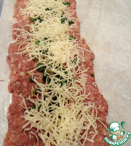 Фарш выложить длинной узкой лентой на пищевую пленку, сверху присыпать мелко порезанной петрушкой и тертым сыром.