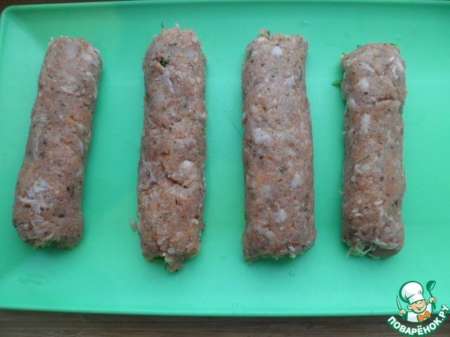 Разрезать рулет на 4 колбаски.