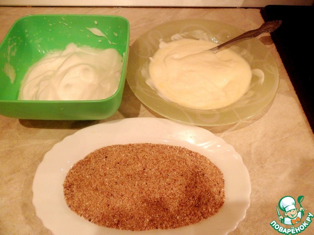 Для шубки смешать желток со сметаной, отдельно взбить белок с щепоткой соли в белую пену. В тарелку насыпать ½ стакана сухарей.