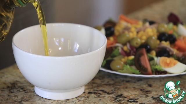 Наливаем в чашку оливковое масло - обязательно НЕрафинированное, вкусное!