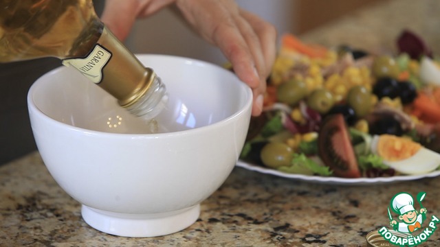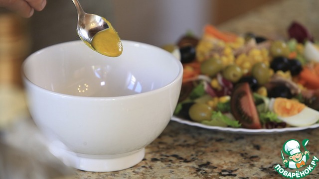 Добавляем в чашку горчицу. Да, в классическом соусе винегрет нет горчицы, но есть лук шалот и зелень - петрушка, эстрагон и т. п. Но сейчас соус винегрет готовят чаще всего именно с горчицей.