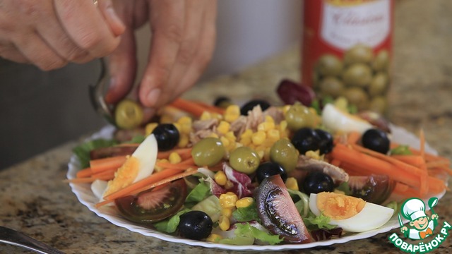Затем консервированный тунец и сладкая кукуруза. Внимание - тунца надо совсем немного - не больше столовой ложки на порцию.