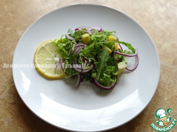 Салат порезать тонко, авокадо и манго кубиками, лук - тонкими полукольцами (кольцами);