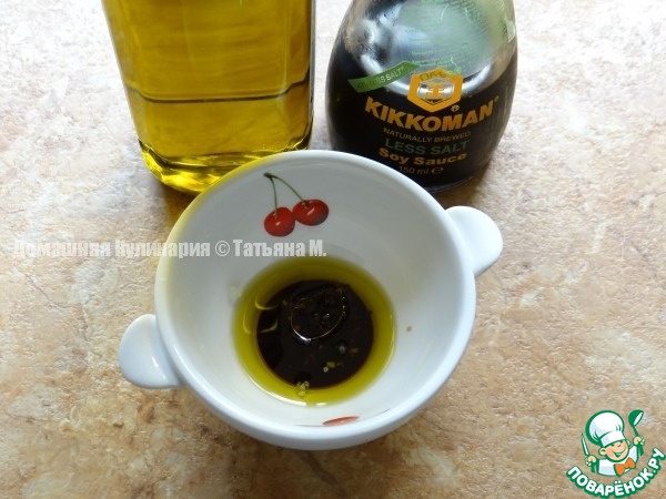 Для заправки смешать масло с соевым соусом, выдавить чеснок - перемешать;