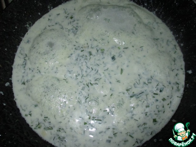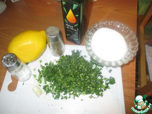 Мелко порубите зелень (петрушку, лук, базилик, укроп), чеснок, добавьте лимонный сок, оливковое масло, сметану. Перемешайте. По вкусу добавьте сахар, соль, перец. Соус готов и его можно подавать на стол к основным блюдам. Но я готовлю дальше.