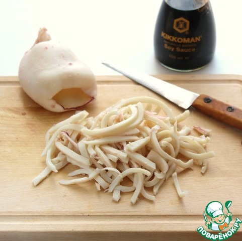 Нарежьте соломкой кальмаров.