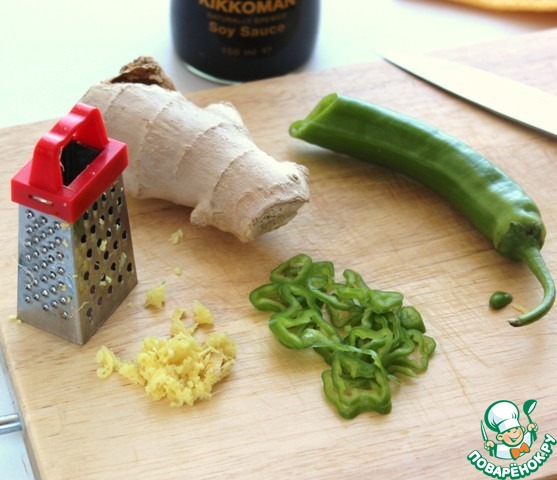 По рецепту необходимо 4 красных перца чили тонко нарезать вместе с семечками, ух... Лично я не смогла решиться на это и взяла 1 зеленую крупную перчину чили средней жгучести и тонко нарезала колечками.