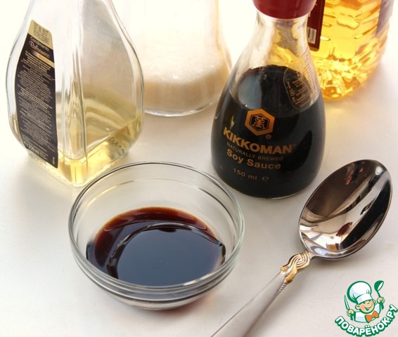 Приготовьте заправку. Смешайте соевый соус Kikkoman, сахар, белый винный уксус, растительное масло.