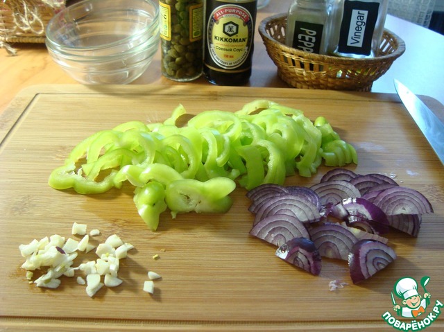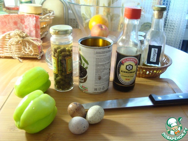 Перцы порежем соломкой, лук-полу-кольцами, чеснок мелко порубим. Яйца перепелиные варим вкрутую.