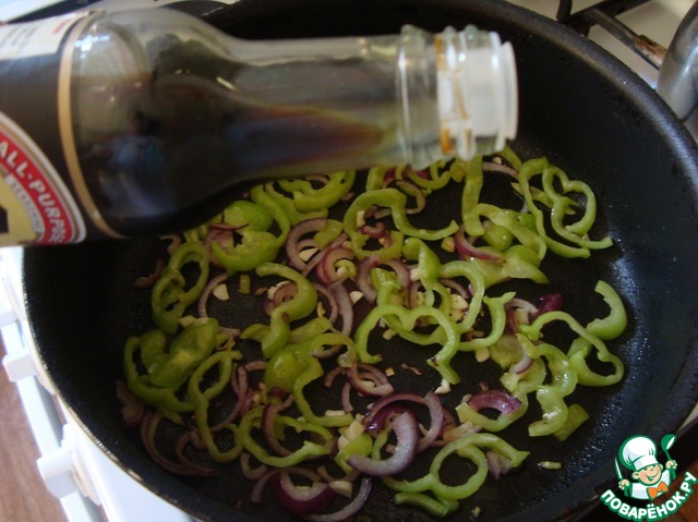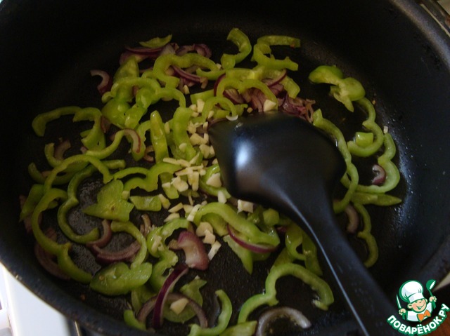 На сковороду нальём оливковое масло и выложим чеснок, лук и потом перцы. Чуть обжарим.