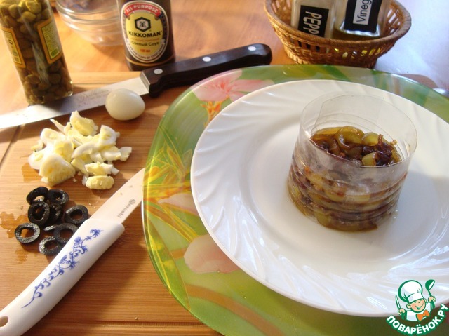 Берём кольцо, чтобы красиво выложить салат в тарелку. Если у вас его нет-не беда!!! Разовое кольцо можно вырезать из пластиковой бутылки, как сделала в данном случае я. Выкладываем в кольцо содержимое сковороды. Яйца мелко рубим, маслины режем на кружочки, петрушку тоже мелко режем.