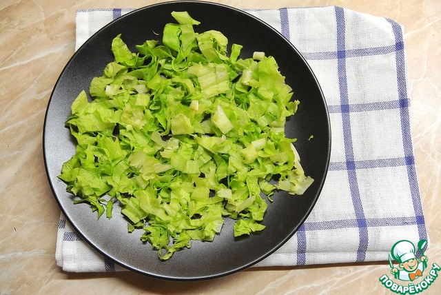Салат порвать руками на очень маленькие кусочки и выложить на тарелку.