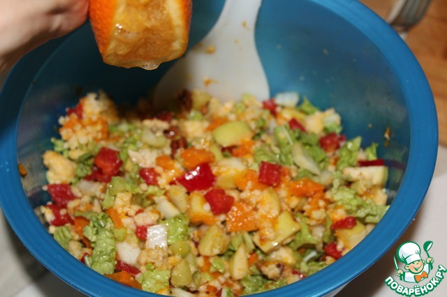 Все ингредиенты (кроме апельсина) смешать в большой миске, полить оливковым маслом и апельсиновым соком и еще раз хорошо перемешать. Приятного аппетита!