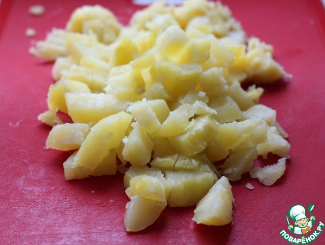Картофель отварить в мундире, почистить и нарезать кубиками.