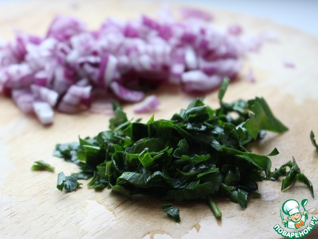 Лук почистить и мелко нарезать, петрушку измельчить.