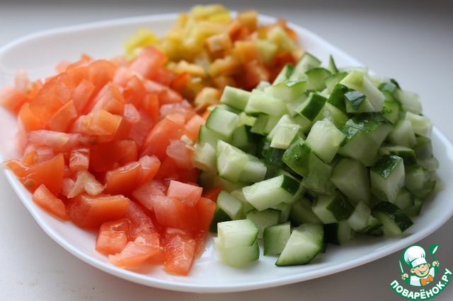 Болгарский перец, помидор и огурец (если у огурца плотная кожура, то лучше ее снять) нарезать небольшими кубиками.