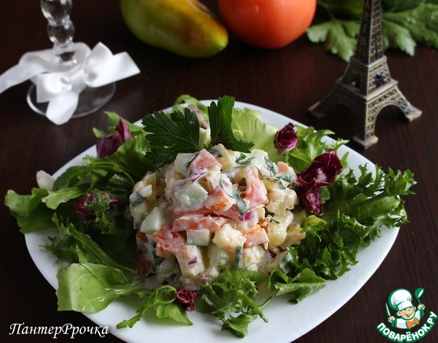 | Этим рецептом поделилась со мной одна знакомая француженка из Эльзаса. Она утверждает, что такой салат очень распространен в этом регионе Франции. Что я могу сказать? Он необыкновенно вкусный, нежный, яркий и красочный. Кроме того, он готовится очень быстро и великолепно подойдет для уютного, домашнего обеда или ужина. |