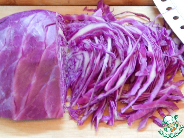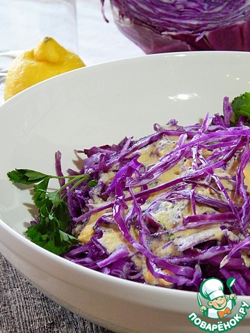 | Salade de choux rouges. Сочный, свежий, ароматный и совсем простой салат. Изюминка здесь в яично-лимонной заправке. Особенность французской кухни - большое разнообразие соусов, по некоторым данным-более 3000. С помощью соуса, при неизменном составе основных продуктов, очень интересно меняется вкус и аромат блюда. С удовольствием предлагаю рецепт. Попробуйте! |