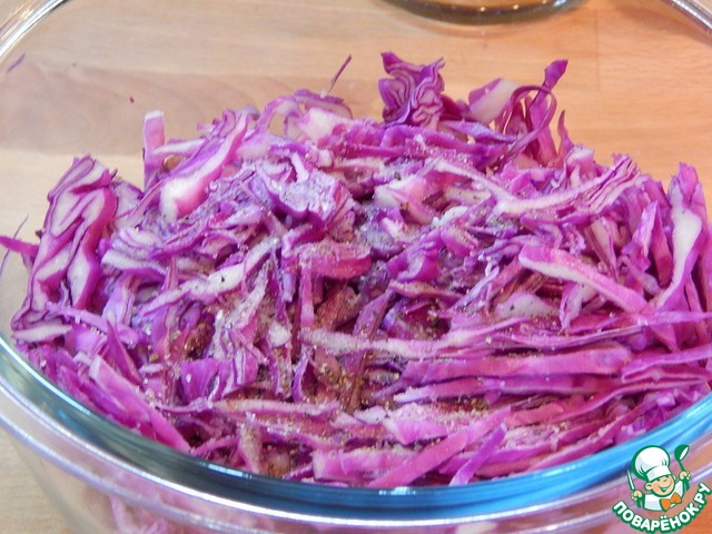 В миске смешиваем с небольшим кол-вом соли и хорошенько перетираем руками до выделения сока. Пусть постоит несколько минут.