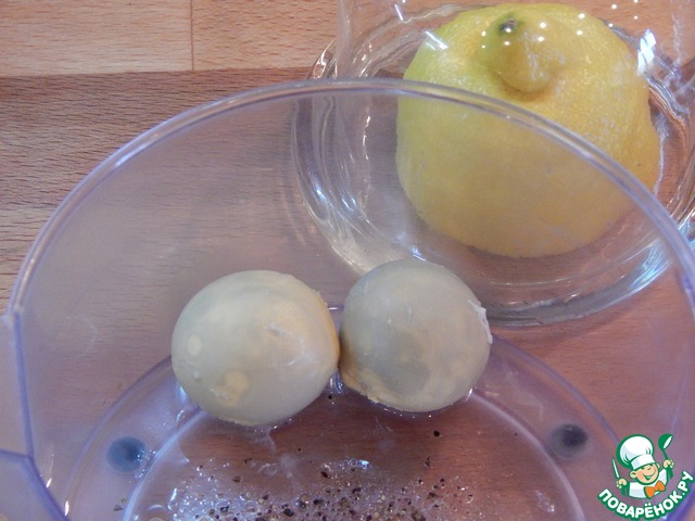 Яйца очищаем, нам нужны желтки. Измельчаем блендером их в пюре, добавляем чеснок, перец, оставшуюся соль, лимонный сок, укроп.